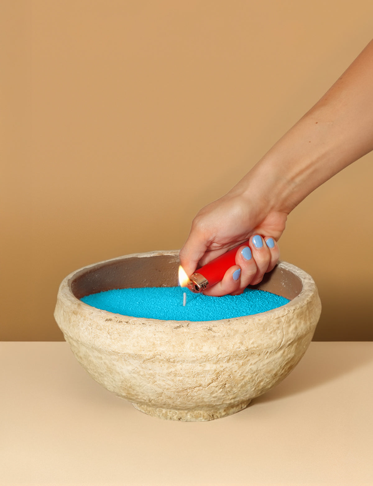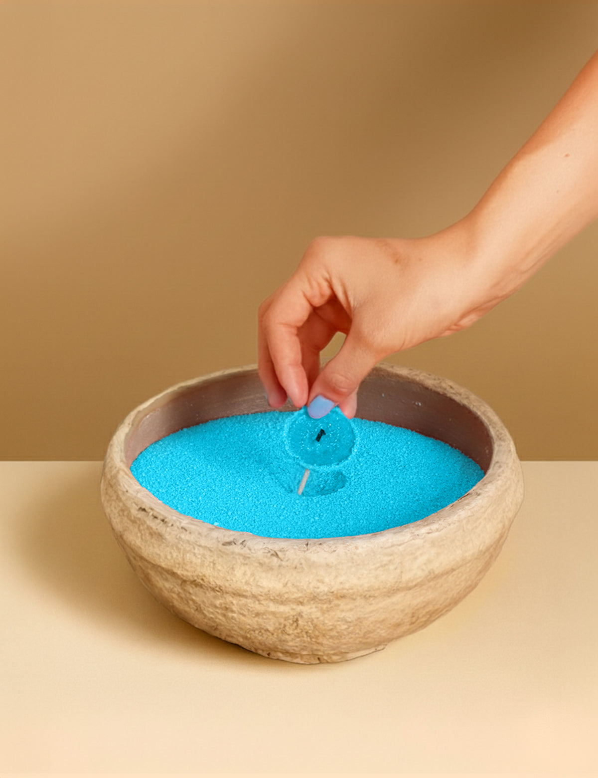 Statt einer fertigen Kerze gestaltest du dein Setup selbst: Du füllst den Kerzensand in ein hitzebeständiges Gefäß deiner Wahl, setzt einen Docht ein und zündest ihn an. Der Docht steht stabil im Sand – ganz ohne Halterung oder Kleber.