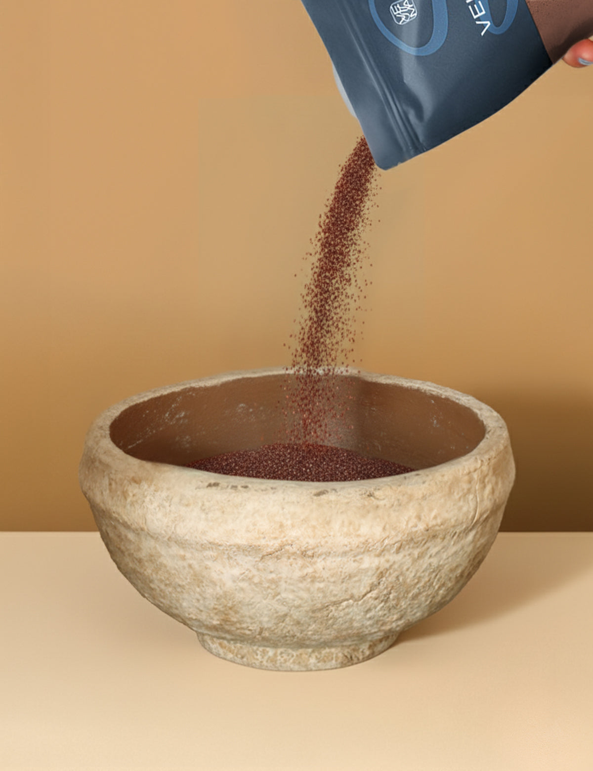 Wähle ein hitzebeständiges Gefäß und fülle Veluma Kerzensand bis zur gewünschten Höhe ein. Größe, Form und Farbe entscheidest du – so, wie es zu dir und deinem Moment passt.