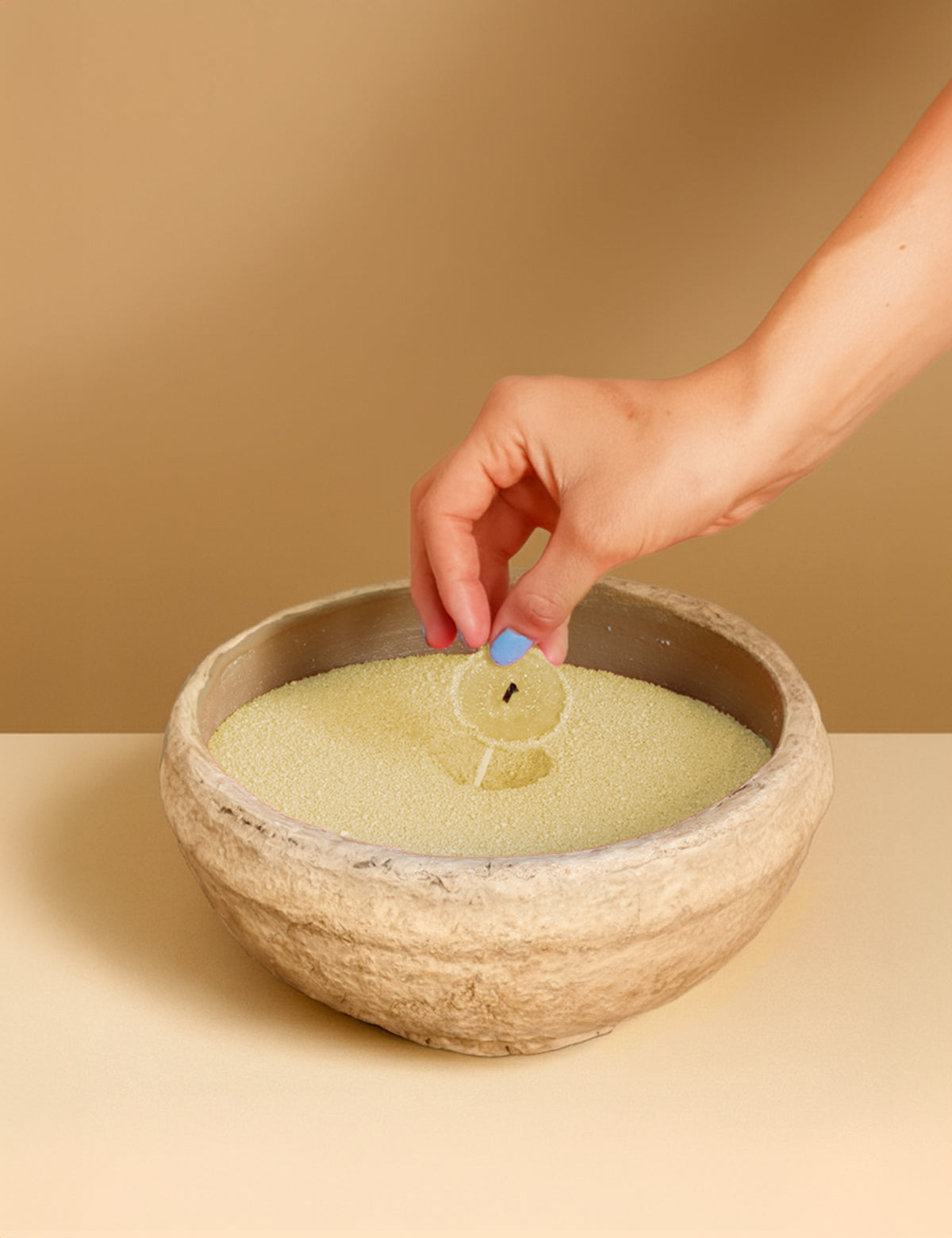 Unser Kerzensand erfüllt dein Zuhause mit wohltuendem Duft und dem Gefühl, angekommen zu sein – ganz ohne Ruß und immer wieder zum Nachfüllen.