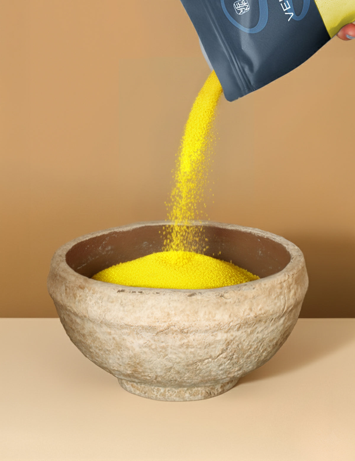 Wähle ein hitzebeständiges Gefäß und fülle Veluma Kerzensand bis zur gewünschten Höhe ein. Größe, Form und Farbe entscheidest du – so, wie es zu dir und deinem Moment passt.