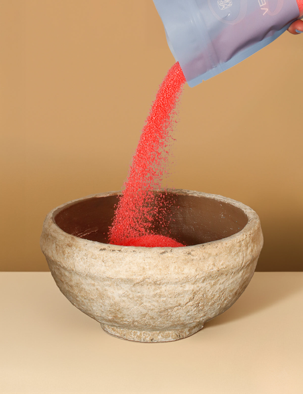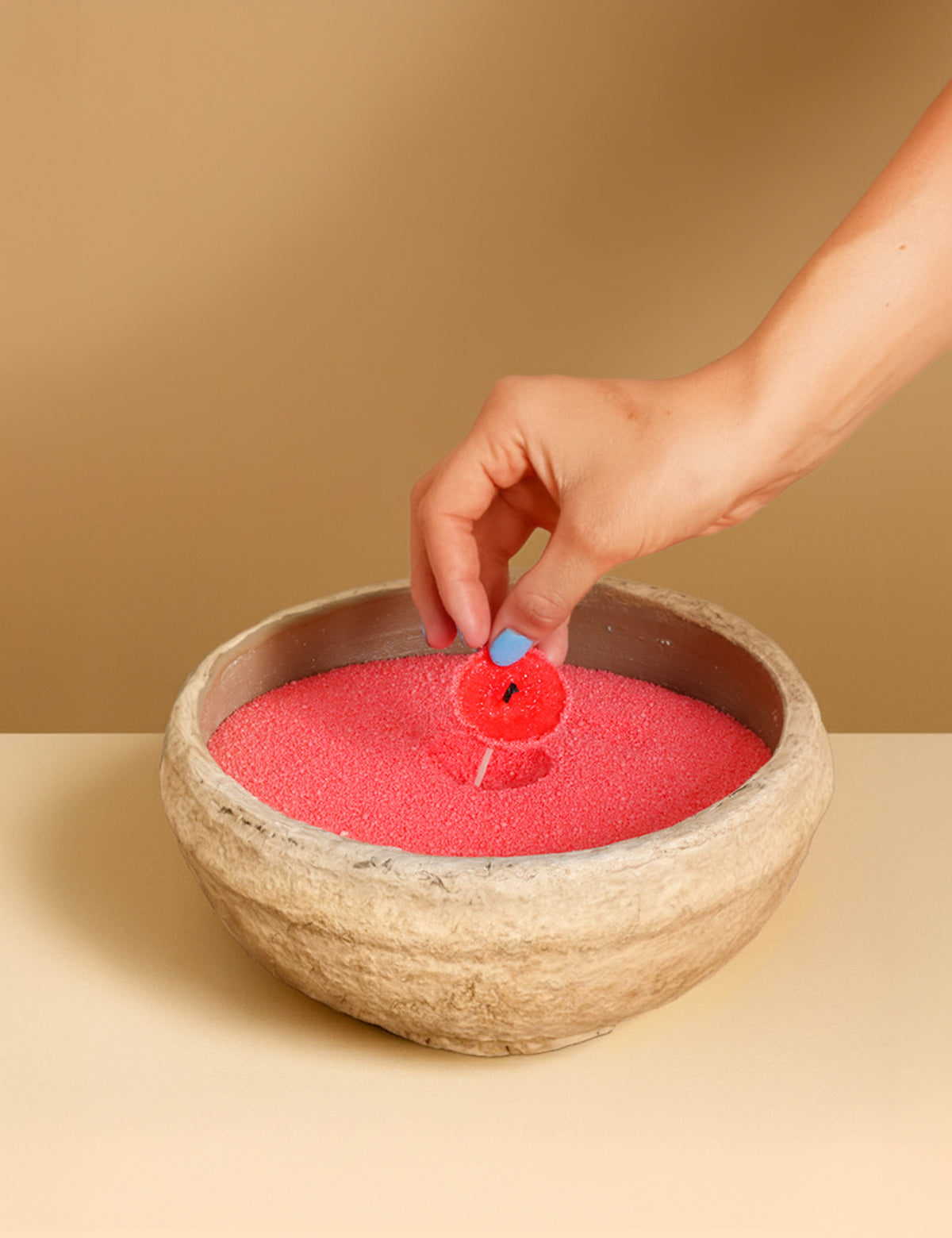 Wähle ein hitzebeständiges Gefäß und fülle Veluma Kerzensand bis zur gewünschten Höhe ein. Größe, Form und Farbe entscheidest du – so, wie es zu dir und deinem Moment passt.